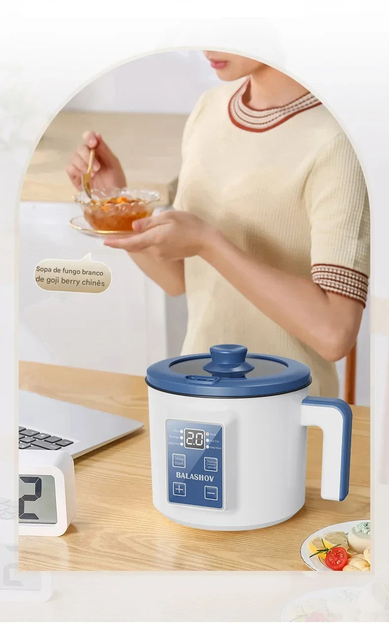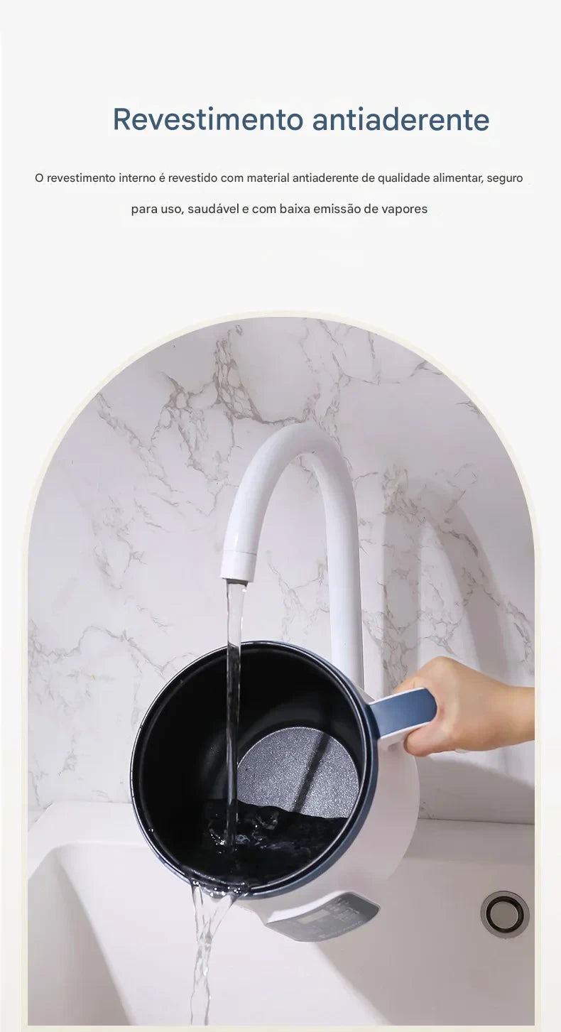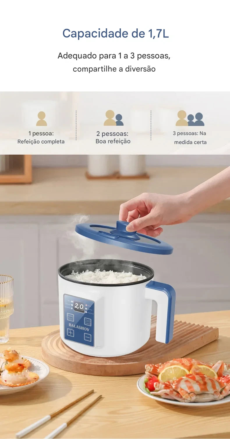 A Mini Panela Elétrica Inteligente 1.7L foi criada para quem precisa de praticidade no dia a dia — especialmente jovens que estão iniciando a vida fora de casa, estudantes com rotina intensa e pessoas idosas que buscam autonomia na cozinha. Compacta, versátil e segura, ela prepara refeições completas sem esforço e sem risco de queimadura a comida.